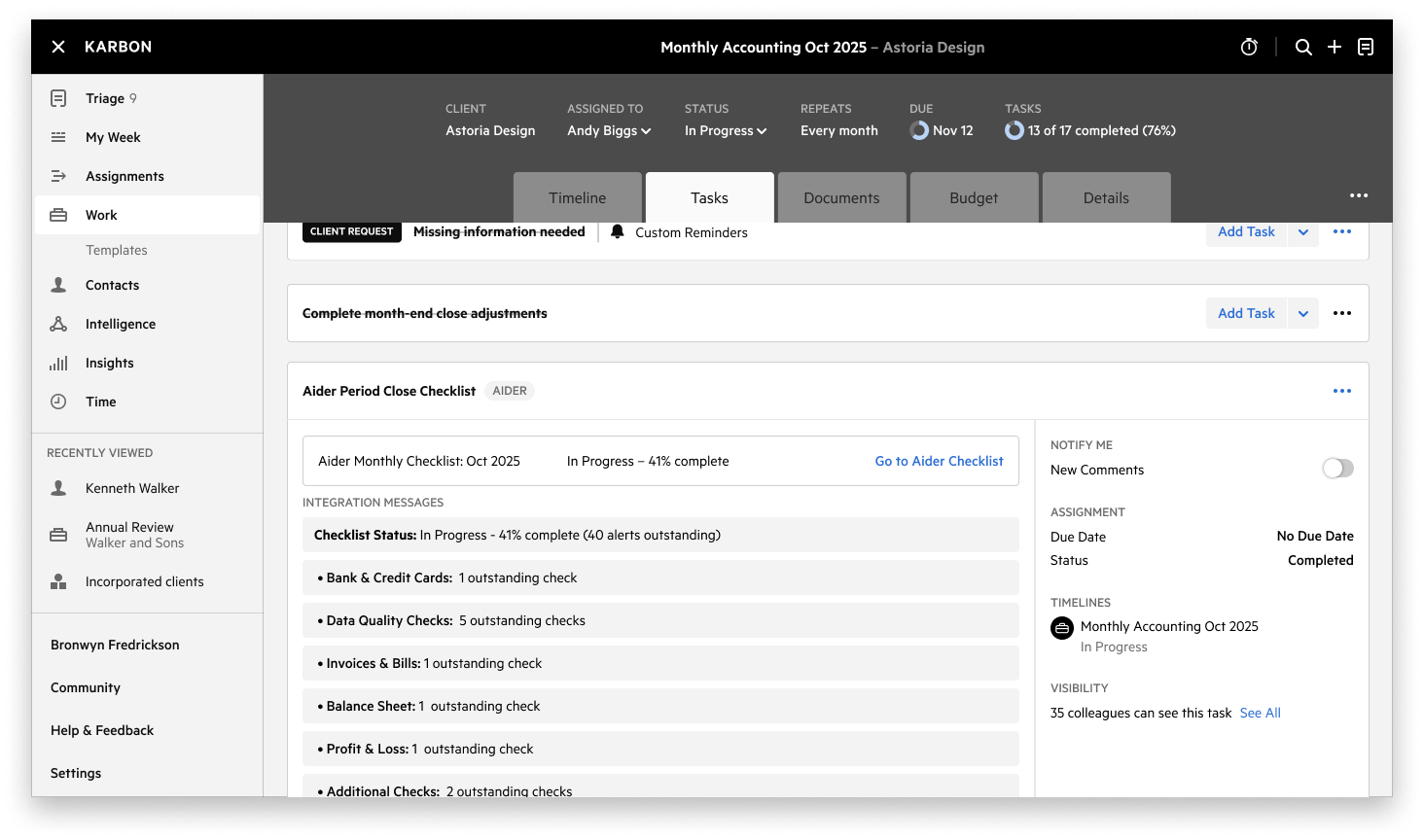 Connect any Aider checklist to a Karbon work item. Close progress, outstanding alerts, and percentage completion sync directly into the integrated task. When a period is marked as closed in Aider, it updates the work item status and triggers any automations you have set up.