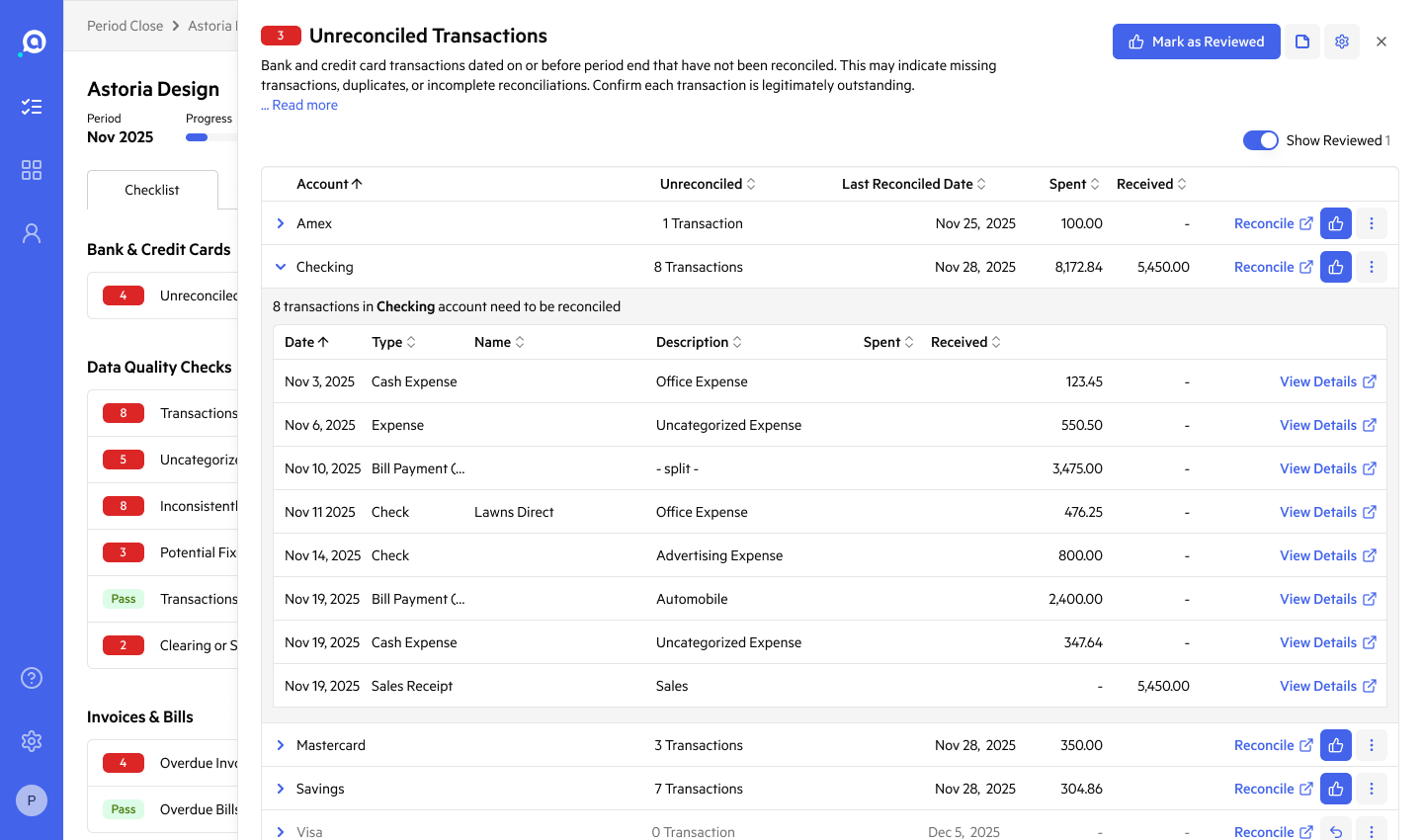 The checklist has been completely redesigned. An alert pane surfaces exactly where work needs attention: unreconciled transactions, data quality issues, outstanding invoices and bills, and P&L and balance sheet variances, organized into clear sections so your team always knows what to work on next. Every built-in check includes a description of what it is, why it matters, and how to resolve it.