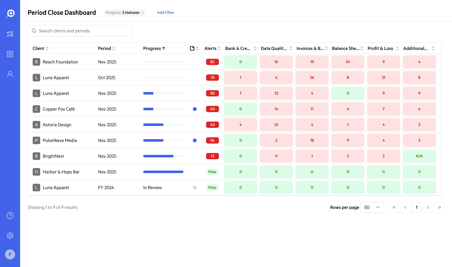 A single view of every client's close status across your portfolio, filterable by period type, industry, and more. See what's complete, what's in progress, and where the biggest issues are, without jumping in and out of client files.